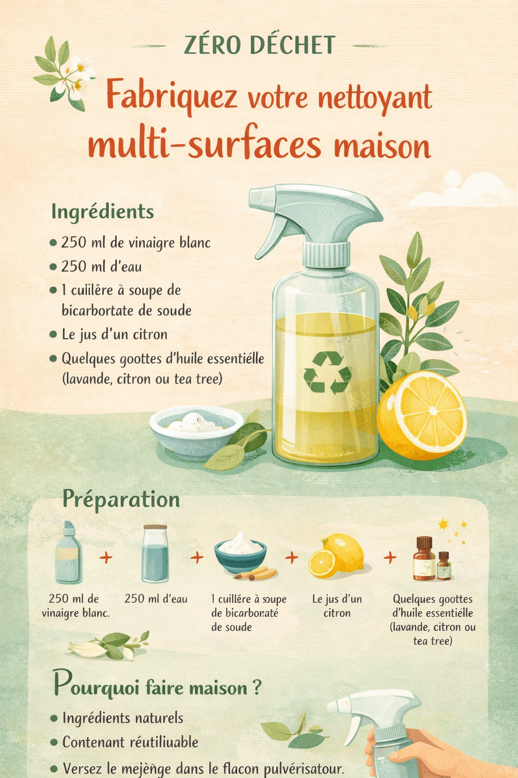 Les produits d’entretien classiques contiennent souvent des composants chimiques agressifs, emballés dans des flacons plastiques à usage unique. En fabriquant votre nettoyant multi-surfaces, vous choisissez :
